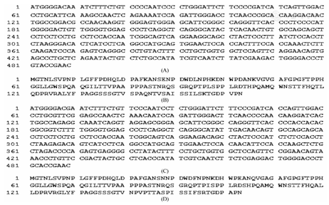 注:A. ASC的B基因型Pre-S核苷酸参考序列;B.ASC的B基因型Pre-S氨基酸参考序列;C.ASC的C基因型Pre-S核苷酸参考序列;D.ASC的C基因型Pre-S氨基酸参考序列