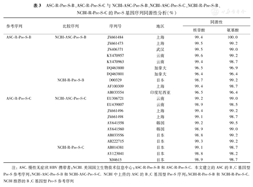 分别以高水平HBsAg组B、C基因型各序列中相同位置同一碱基出现频率最高的碱基作为参照碱基,建立ASC-R-Pre-S-B和ASC-R-Pre-S-C,结果见图1。与NCBI-ASC-Pre-S-B、NCBI-ASC-Pre-S-C及NCBI-R-Pre-S-B、NCBI-R-Pre-S-C进行核苷酸和氨基酸同源性分析,发现建立的ASC-R-Pre-S-B和ASC-R-Pre-S-C分别与中国大多数地区报道的ASC的B和C基因型Pre-S序列具有非常高的同源性(99.2%~100.0%),与NCBI推荐的亚洲B和C基因型多数Pre-S参考序列具有较高的同源性(98.2%~99.5%),而距中国较远地区则同源性偏低(加拿大和印度尼西亚,96.4%~96.9%)(表3)。