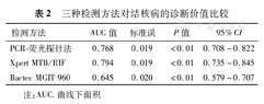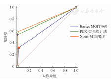 根据不同检测方法检测样本在选择的各点上的灵敏度和特异度,绘成ROC曲线以临床确诊为状态变量拟和对结核病诊断效能的ROC曲线。分别以PCR-荧光探针法、Xpert MTB/RIF和Bactec MGIT 960为检验变量时,ROC曲线下面积(AUC)分别为0.768、0.794和0.645。PCR-荧光探针法和Xpert MTB/RIF的诊断价值均高于Bactec MGIT 960(Z=5.19和6.52,P值均<0.01)。Xpert MTB/RIF优于PCR-荧光探针法(Z=2.80,P<0.05)(图1,表2)。