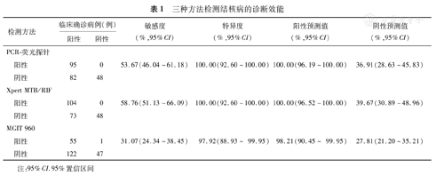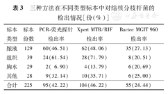 | 标本类型 | 标本份数 | PCR-荧光探针检出率 | Xpert MTB/RIF检出率 | Bactec MGIT 960检出率 |