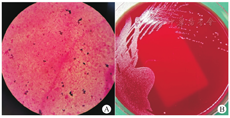 注:A.血培养革兰染色(×1 000);B.血培养阳性瓶转种血琼脂培养基菌落形态(35 ℃,约36 h)