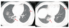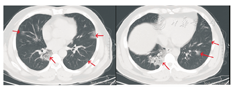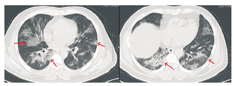 患者男,47岁,黑龙江省哈尔滨市人。因"发热5 d"于2020年1月21日收入我院发热留观病房。既往健康,否认慢性病史及传染病史。患者为火车司机,往返于哈尔滨——武汉区间。发病前两周曾两次随车到达武汉,并在武汉火车站站台逗留。2020年1月16日开始出现发热,体温在37.5~39 ℃,伴畏寒,无寒战。无咳嗽及咯痰,无喘息及呼吸困难。入院前1 d曾有轻微腹泻症状,排稀便两次,未见脓血。入院后查体:一般状态尚可,呼吸平稳,体温38.2 ℃,脉搏108次/min,呼吸16次/min,血压140/95 mmHg(1 mmHg=0.133 kPa)。球结膜轻度充血,双肺听诊呼吸音清,未闻及干湿啰音。入院当日在我院发热门诊行血常规检查:白细胞(WBC)6.14×109/L,中性粒细胞占比0.560,淋巴细胞占比0.337,淋巴细胞绝对计数2.07×109/L,单核细胞占比0.103,红细胞及血小板计数正常。胸部CT:左肺及右肺上下叶可见斑片影,边界模糊。影像学诊断:左肺及右肺上下叶炎性改变(图1)。入院当日市疾控中心行咽拭子2019-nCoV核酸检测阴性,其他相关检查结果:C-反应蛋白16.8 mg/L(参考值0~8 mg/L),红细胞沉降率38.00 mm/1 h(参考值0~15 mm/1 h),降钙素原0.10 ng/mL(参考值0~0.046 ng/mL),肌红蛋白203 ng/mL(参考值0~154.9 ng/mL),肌酸激酶1 149.60 U/L(参考值38~174 U/L),G-脂多糖、肝肾功能、凝血功能正常。相关病原学检查:甲型流感病毒、乙型流感病毒、副流感病毒-2型、嗜肺军团菌、肺炎支原体、肺炎衣原体、Q热立克次体、腺病毒、呼吸道合胞病毒、风疹病毒、单纯疱疹病毒、巨细胞病毒、弓形虫IgM抗体均阴性。EBV DNA定量<5.0×102拷贝/mL。入院当日开始静脉点滴盐酸莫西沙星氯化钠注射液(0.4 g/d),口服磷酸奥司他韦胶囊(75 mg/次,2次/d),补液对症治疗。1月23日,患者仍有间断高热,体温可达40 ℃。偶有轻微干咳,无痰。市疾控中心第2次咽拭子2019-nCoV核酸检测仍为阴性,我院复查血常规:WBC 4.89×109/L,中性粒细胞占比0.583,淋巴细胞占比0.319,淋巴细胞绝对计数1.56×109/L,单核细胞占比0.098。胸部CT:双肺可见斑片影及磨玻璃影,边界模糊。影像学诊断:双肺炎性改变(图2)。咽拭子细菌培养、血细菌+真菌培养未检出病原体。继续给予上述药物治疗,同时行物理降温,未应用退热药物。因两次2019-nCoV核酸检测阴性,建议患者回家中自行隔离治疗。1月24日患者仍有发热,咳嗽频繁,咯白痰,且患者配偶亦出现发热症状,即到我院急诊内科留观隔离,继续予盐酸莫西沙星氯化钠注射液静脉点滴、口服磷酸奥司他韦胶囊(两种药物剂量同上)。1月26日患者仍发热,体温最高达38.5 ℃,自觉胸闷、呼吸急促,查动脉血气分析:PaO2/FiO2:342 mmHg。血常规:WBC 4.37×109/L,中性粒细胞占比0.687,淋巴细胞占比0.197,淋巴细胞绝对计数0.86×109/L,单核细胞占比0.115。胸部CT:双肺可见淡片影,磨玻璃影,范围较前扩大,边界不清。影像学诊断:双肺炎症(图3)。1月27日我院组织院内专家会诊,认为该患者虽然两次2019-nCoV核酸检测阴性,但结合流行病学史及临床表现(高热,淋巴细胞计数进行性减少、肺部间质性病变且进行性加重),不能排除2019-nCoV感染,申请市疾控中心行第3次咽拭子2019-nCoV核酸检测,结果仍为阴性。患者仍维持原治疗方案治疗。1月28日患者体温趋于正常,自行离院,在家中继续隔离治疗。每3日对患者进行电话随访,患者未再出现发热,咳嗽、咯痰明显缓解,未出现呼吸困难。因疫情期间特殊情况,未到我院进行相关复查。