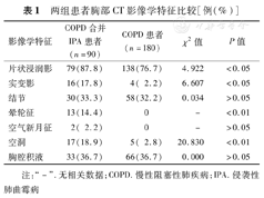 | 影像学特征 | COPD合并IPA患者(n=90) | COPD患者(n=180) | χ2值 | P值 |