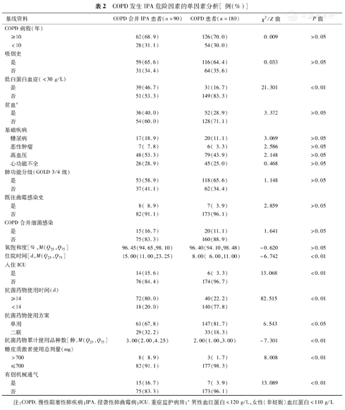 | 基线资料 | COPD合并IPA患者(n=90) | COPD患者(n=180) | χ2 /Z值 | P值 | |