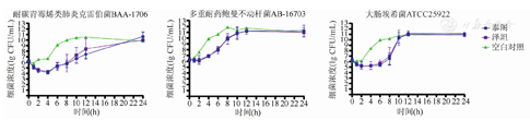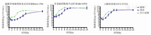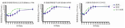 替加环素标准品对三株细菌的MIC分别为:大肠杆菌ATCC25922 0.06 μg/mL,耐碳青霉烯肺炎克雷伯菌ATCC BAA 1706为0.50 μg/mL,临床分离血流感染菌株多重耐药鲍曼不动杆菌AB-16703为1.00 μg/mL。