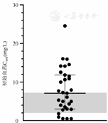初始利奈唑胺给药剂量后,31例新生儿患者血药Cmin为7.12(3.03,11.86)mg/L(图1),5例(16.13%)初始血药Cmin<2 mg/L,其中2例调整给药方案为10 mg/kg,6 h/次,调整后复查血药Cmin显示1例达标,1例较高;10例(32.26%)初始血药Cmin在2~7 mg/L的浓度范围内;16例(51.61%)初始血药Cmin >7 mg/L,其中12例初始血药C min>10 mg/L,4例明显偏高(分别为16.06 mg/L、14.57 mg/L、14.16 mg/L、10.65 mg/L),调整给药方案为10 mg/kg,12 h/次后有2例患儿复查血药Cmin为达标,余2例因考虑到新生儿医源性失血、抗感染治疗有效等原因未复查血药浓度(图2)。其余11例初次血药Cmin未达标患儿因初次血药Cmin结果出来时已更换治疗方案或好转停药,未进行给药方案调整。
