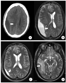 注:A.右侧额颞顶枕部硬膜外积液,右侧脑室受压狭窄,中线结构左移;B.右侧硬膜下积脓;C.脓肿引流和抗生素治疗近2个月后脓肿缩小;D.右侧大脑半球多发异常信号