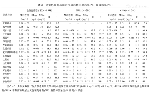 | 抗菌药物 | 金黄色葡萄球菌(n=1 438) | MRSA(n=394) | MSSA(n=1 044) | ||||||||||||
