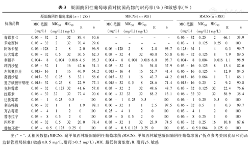 | 抗菌药物 | 凝固酶阴性葡萄球菌(n=1 285) | MRCNS(n=905) | MSCNS(n=380) | ||||||||||||