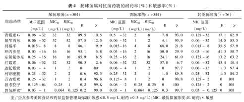 | 抗菌药物 | 屎肠球菌(n=504) | 粪肠球菌(n=344) | 其他肠球菌(n=76) | ||||||||||