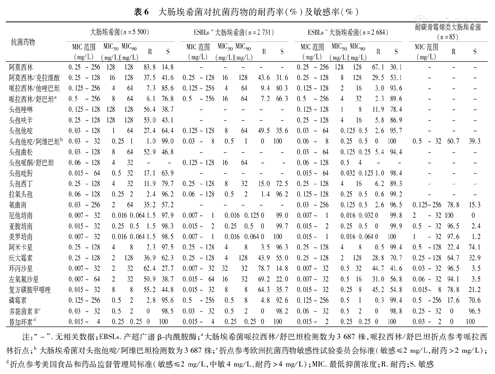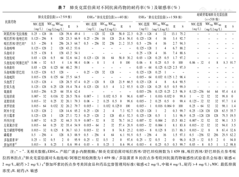 | MIC范围(mg/L) | MIC50(mg/L) | MIC90(mg/L) | R | S | MIC范围(mg/L) | MIC50(mg/L) | MIC90(mg/L) | R | S | MIC范围(mg/L) | MIC50(mg/L) | MIC90(mg/L) | R | S | |
