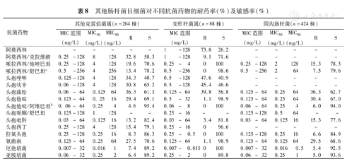 其他肠杆菌目细菌不同抗菌药物的耐药率(%)及敏感率(%)