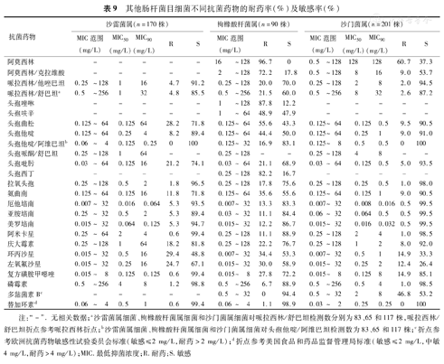 注:"-".无相关数据;a沙雷菌属细菌、枸橼酸杆菌属细菌和沙门菌属细菌对哌拉西林/舒巴坦检测数分别为83、65和117株,哌拉西林/舒巴坦折点参考哌拉西林折点;b沙雷菌属细菌、枸橼酸杆菌属细菌和沙门菌属细菌对头孢他啶/阿维巴坦检测数为83、65和117株;c折点参考欧洲抗菌药物敏感性试验委员会标准(敏感≤2 mg/L,耐药>2 mg/L);d折点参考美国食品和药品监督管理局标准(敏感≤2 mg/L,中敏4 mg/L,耐药>4 mg/L);MIC.最低抑菌浓度;R.耐药;S.敏感