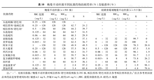 | 抗菌药物 | 鲍曼不动杆菌(n=501株) | 耐碳青霉烯鲍曼不动杆菌(n=313株) | ||||||||