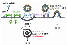 2019-nCoV的S蛋白决定病毒的宿主范围和特异性,是单克隆中和抗体及疫苗设计的关键作用靶点。2019-nCoV的S蛋白类似螺丝钉,但头部更大,柄部也较细长,以三聚体的形态存在,主要包括3个S1头部亚基和1个三聚体S2亚基。其中S1亚基头部尖端含有受体结合域(RBD),可以与人血管紧张素转化酶2(ACE2)受体结合,这种结合有助于病毒附着至靶细胞的表面[2]。病毒进入宿主细胞过程中,除了ACE2,很可能还需要两种跨膜蛋白酶:即可以切割ACE2的跨膜金属蛋白酶-ADAM17以及参与ACE2和2019-nCoV膜融合过程的丝氨酸蛋白酶(TMPRSS2)。通过在S蛋白的S1/S2和S2'位点切割TMPRSS2,可激活S蛋白,并允许病毒膜和细胞膜融合,这一过程由S2亚基驱动(图1)[3,4]。病毒进入宿主细胞通过RBD的基因重组或突变可以实现不同宿主间的传播,并导致较高致死率。在S1亚基,RBD与靶细胞上的ACE2受体结合后,S2亚基中的七肽重复域(HR)1和HR2相互作用,形成六螺旋束(6-HB)融合核心,使病毒更接近细胞膜,促进病毒膜和宿主细胞膜的融合和感染。Zhou等[5]认为在2019-nCoV感染细胞过程中,其S蛋白的S2亚单位是介导病毒与细胞膜融合的主要病毒元件。2019-nCoV和严重急性呼吸综合征冠状病毒(SARS-CoV)的S2亚单位具有89.8%的序列同一性和96.9%的序列相似性,且二者受体均为ACE2。不同的是,2019-nCoV的S蛋白S1亚单位中RBD与ACE2结合的亲和力比SARS-CoV高10~20倍,这可能是2019-nCoV感染性和传播性更强的主要原因。