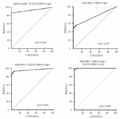 将间接免疫荧光法检测单一指标中AUC值最高的2项(低亲和力EBV-CA IgG和EBV-CA IgM)与PCR法进行联合诊断,联合指标EBV-CA IgM+低亲和力EBV-CA IgG、EBV-DNA+EBV-CA IgM、EBV-DNA+低亲和力EBV-CA IgG以及EBV-DNA+EBV-CA IgM+低亲和力EBV-CA IgG的AUC值分别为0.934(95%CI:0.900~0.959)、0.757(95%CI:0.706~0.804)、0.963(95%CI:0.935~0.981)和0.999(95%CI:0.986~1.000)。EBV-DNA+EBV-CA IgM+低亲和力EBV-CA IgG联合检测的AUC值最高,与其他单一以及联合检测指标相比差异均有统计学意义(P均<0.05)。详见图1、表4。