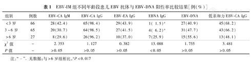 EBV-IM组不同年龄段患儿EBV抗体与EBV-DNA阳性率比较结果[例(%)]