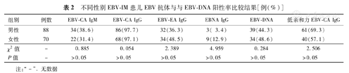 不同性别EBV-IM患儿EBV抗体与与EBV-DNA阳性率比较结果[例(%)]