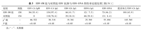 | EBV-IM组 | 158 | 56(35.4) | 154(97.4) | 66(41.7) | 12( 7.5) | 73(46.2) | 101(63.9) |