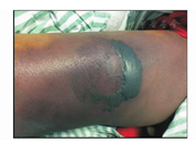 18例患者平均年龄(62±9)岁,其中男性14例,女性4例。发病年份:2012~2015年3例,2016~2020年15例。发病月份为6~10月份,以8月份为多。职业分布:农民2例,家庭主妇4例,销售海鲜4例,渔民6例,工人1例,无业1例。感染途径:9例有处理海产品史,6例进食海产品,3例原因不明。基础疾病:15例合并基础疾病,其中合并慢性肝病6例,包括慢性乙型病毒性肝炎3例、肝硬化2例和肝癌术后1例。患者皮肤表现可见蜂窝织炎,张力性水泡迅速演变成紫色血性大疱(见图1)。主要临床症状:红肿(16例),发热(15例),张力性水泡(8例),寒战、休克、皮疹和瘀斑各6例,筋膜坏死(3例)。临床亚型:原发性脓毒症15例,皮肤感染3例。18例患者中死亡11例。LRINCE评分:<6分7例(死亡3例),6~8分8例(死亡5例),>8分3例(死亡3例)。
