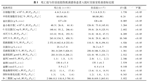 | 检测项目 | 死亡组(n=11) | 存活组(n=7) | Z/t值 | P值 |
