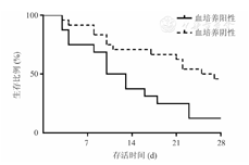 ±s表示,采用成组t检验或配对t检验进行比较。不符合正态分布的计量资料采用中位数(M)和上下四分位数间距(P25,P75)表示,采用Mann-WhitneyU秩和检验进行比较。计数资料采用例(百分比)表示,采用χ2检验进行比较。采用Kaplan-Meier法绘制CRKP血培养阳性组和阴性组患者接受CZA治疗后28 d生存曲线,并采用log-rank检验进行比较。P<0.05为差异具有统计学意义。