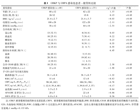 | 合并CRAB感染[例(%)] | 10(25.0) | 10(43.5) | 2.30 | >0.05 | |