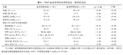 | 变量 | 血培养阳性组(n=16) | 血培养阴性组(n=24) | t/χ2/Z值 | P值 | |