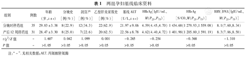 发生轻度ALT异常的患者中两组各有1例患者(ALT峰值分别为197 U/L和162 U/L,HBV DNA载量分别为3.82×108 IU/mL和8.43×107 IU/mL)因反复肝功能异常分别于产后半年和产后1年加用TDF抗病毒治疗,其余患者在指导休息后未予特殊药物处理肝功能均恢复正常。