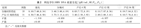 两组孕妇HBV DNA载量变化[lgIU/mL,M(P25,P75)]