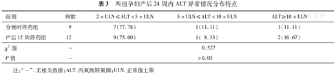 随访期间,入组的66例患者共有21例出现产后ALT异常,分娩时停药组9例(25.71%,9/35),产后12周停药组12例(38.71%,12/31),两组差异无统计学意义(χ2=1.280,P>0.05)。分娩时停药组9例患者均出现在产后12周内,其中产后4周1例,产后8周6例,产后12周2例;产后12周停药组中,产后4周出现ALT异常3例,产后8周2例,产后12周3例,产后24周4例。两组孕妇产后12周内ALT异常发生率分别为25.71%(9/35)和25.81%(8/31),差异无统计学意义(χ2=0.0001,P>0.05)。进一步分析显示,两组患者产后肝功能异常多以轻度异常为主,且肝功能异常程度分布情况差异无统计学意义(χ2=0.527,P>0.05)(表3)。同时,在整个随访过程中,所有ALT异常患者均未发现TBil明显升高(均<2×ULN)以及凝血功能异常。