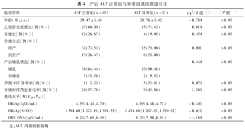 | 临床资料 | ALT正常组(n=45) | ALT异常组(n=21) | t/χ2/Z值 | P值 | |