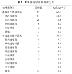 128例患者共分离出128株链球菌,根据在血琼脂平板上是否产生溶血分为:β-溶血性链球菌属87株(68.0%),主要为停乳链球菌51株(39.8%)和无乳链球菌25株(19.5%);α-溶血性链球菌属41株(32.0%),主要为肺炎链球菌8株(6.2%)、咽峡炎链球菌5株(3.9%)、星座链球菌4株(3.1%)和缓症链球菌4株(3.1%)(表2)。