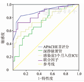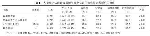 相较于深静脉置管、感染前3个月入住ICU,APACHEⅡ评分≥17.50和联合指标的AUC更高(P<0.05)(图1和表5)。