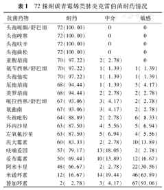 | 头孢他啶 | 70( 97.22) | 1( 1.39) | 1( 1.39) |