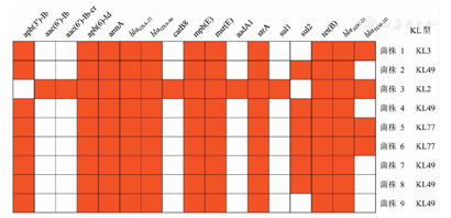 所有菌株均为ST2型,blaOXA-23是本研究中唯一检测到的碳青霉烯酶基因。1株荚膜型为KL3,5株为KL49,2株为KL77,1株为KL2(图1)。