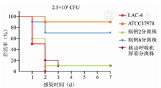 基因组分析表明,参与死亡病例传播链和可移动呼吸机分离出的菌株与高毒力菌株LAC-4具有相同的荚膜型(KL49),因此选取病例2、病例6和可移动呼吸机分离株在小鼠肺部感染模型中进行了毒力检测,并使用LAC-4作为高毒力阳性对照。使用2.5×108 CFU的菌液感染小鼠,病例2、呼吸机分离株和LAC-4的7 d生存率分别为10%、10%和0,而病例6和ATCC17978的生存率则分别为70%和90%(n=10,P<0.01)(图4)。