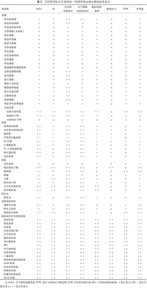 注:BALF.支气管肺泡灌洗液;FFPE.福尔马林固定石蜡包埋;NTM.非结核分枝杆菌;HIV.人类免疫缺陷病毒;±表示意义不明;+表示可能有意义;++表示有意义