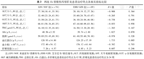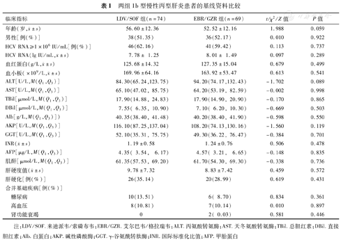 | 指标 | LDV/SOF组(n=74) | EBR/GZR组(n=69) | Z/t值 | P值 |