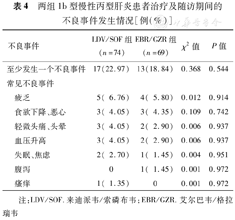 治疗期间,LDV/SOF组17例(22.97%)发生不良事件,EBR/GZR组13例(18.84%)发生不良事件,均无严重不良事件发生,两组不良事件发生率比较差异无统计学意义(χ2=0.368,P=0.544)。LDV/SOF组主要不良事件为疲乏(6.76%)、食欲下降或恶心(4.05%)、轻微头痛或头晕(4.05%)及血压升高(4.05%)等;EBR/GZR组主要不良事件为疲乏(5.80%)和食欲下降或恶心(4.35%)等,见表4。