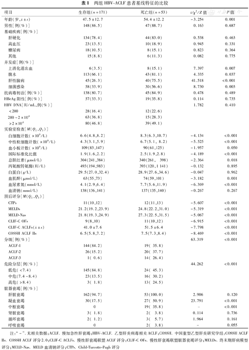 收集皖南医学院第一附属医院和福建医科大学附属泉州第一医院2018年1月至2021年12月连续收治的HBV-ACLF患者共224例,年龄为(49.2±12.9)岁,男性195例,女性29例,肝硬化178例,非肝硬化46例。纳入标准:(1)慢性HBV感染:HBsAg和(或)HBV DNA阳性6个月以上[8];(2)入院时或住院4周内达到COSSH ACLF诊断标准[7]。COSSH分级标准:ACLF 1级(ACLF-1),肾脏衰竭(血肌酐≥177 μmol/L)或使用肾脏替代治疗,或同时存在肝衰竭(TBil≥205 μmol/L)伴凝血障碍(1.5≤INR<2.5)和(或)肾功能障碍(血肌酐133~168 μmol/L)和(或)中枢障碍(HE 1~2级),或同时存在任一肝外脏器(凝血、循环、呼吸)衰竭伴肾功能障碍和(或)中枢障碍,或同时存在中枢衰竭(HE 3~4级)伴肾功能障碍;ACLF 2级(ACLF-2),存在2种脏器衰竭;ACLF 3级(ACLF-3),脏器衰竭数≥3种[7]。排除标准:(1)年龄<18岁或>80岁;(2)妊娠期女性;(3)合并其他病原体所致的慢性肝病[如酒精性肝病(ALD)]或重叠感染非HBV嗜肝病毒(如甲型肝炎、丙型肝炎);(4)合并肝脏或肝外恶性肿瘤;(5)合并严重的肝外器质性疾病;(6)使用免疫抑制剂治疗肝外器质性疾病;(7)入院48 h内死亡或自动出院,或接受肝移植手术;(8)重要临床资料缺失;(9)失访。本研究符合《赫尔辛基宣言》的研究要求。