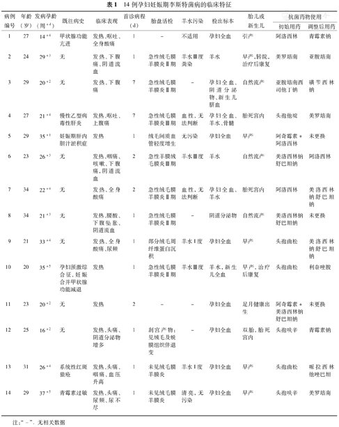 | 14 | 29 | 37+5 | 青霉素过敏 | 发热、头痛、尿频、尿不尽 | 1 | 未见绒毛膜羊膜炎 | 清亮,无污染 | 孕妇全血 | 早产 | 头孢呋辛 | 美罗培南 |