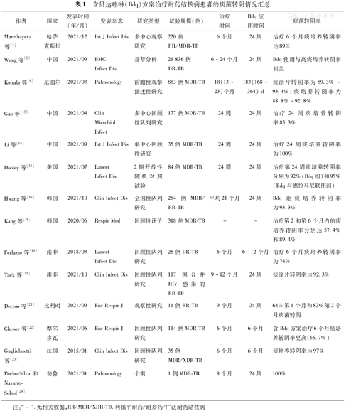 | Wang等[5] | 中国 | 2021/09 | BMC Infect Dis | 荟萃分析 | 21 836例DR-TB | 6~24个月 | 24周 | Bdq使用与高痰培养转阴率相关 |