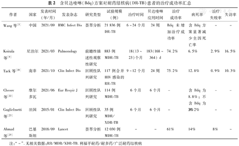总之,大多数非随机对照研究结果提示,含Bdq方案可提高DR-TB治疗成功率,降低病死率,但个别研究也提示有高病死率问题,具体见表2。