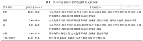 手术部位感染(Surgical site infection, SSI)是指发生在手术切口浅部和深部组织、手术器官或腔隙的感染[1]。作为实体器官移植受者术后早期感染的主要形式,SSI发生率为3.0%~53.0%,高于普通手术患者(3.0%~32.7%)[1,2]。SSI是实体器官移植术后受者住院时间延长及死亡的重要原因,须引起重视。
