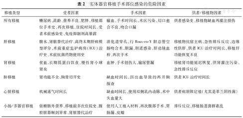 小肠移植与多器官移植后SSI危险因素详见表2,须关注术中人工植入材料使用情况、术后胃肠漏发生情况等小肠/多器官移植特异性危险因素[2]。
