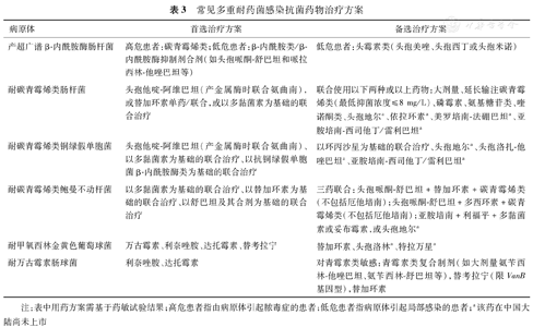 | 耐碳青霉烯类肠杆菌 | 头孢他啶-阿维巴坦(产金属酶时联合氨曲南),或替加环素单药/联合,或以多黏菌素为基础的联合治疗 | 联合使用以下两种或以上药物:大剂量、延长输注碳青霉烯类(最低抑菌浓度≤8 mg/L)、磷霉素、氨基糖苷类、喹诺酮类、头孢地尔a、依拉环素a、美罗培南-法硼巴坦a、亚胺培南-西司他丁/雷利巴坦a |