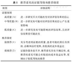 本指南中的证据等级分为A、B和C 3个级别,推荐强度分为1和2两个级别,见表1(根据GRADE分级修订)。