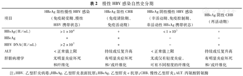 慢性HBV感染自然史的划分主要依据病毒学、生物化学及组织学特征等进行综合考虑。为便于理解,一般将慢性HBV感染划分为4个期[25,26],即HBeAg阳性慢性HBV感染(也称免疫耐受期、慢性HBV携带状态)、HBeAg阳性CHB(也称免疫清除期、免疫活动期)、HBeAg阴性慢性HBV感染(也称非活动期、免疫控制期、非活动性HBsAg携带状态)和HBeAg阴性CHB(也称再活动期),见表2。