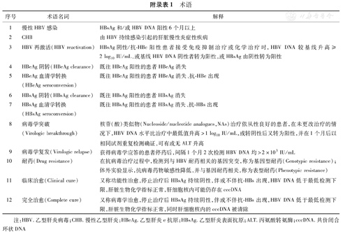 | 9 | 病毒学复发(Virologic relapse) | 获得病毒学应答的患者停药后,间隔1个月2次检测HBV DNA均>2×103 IU/mL |
